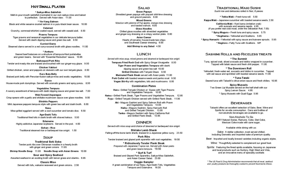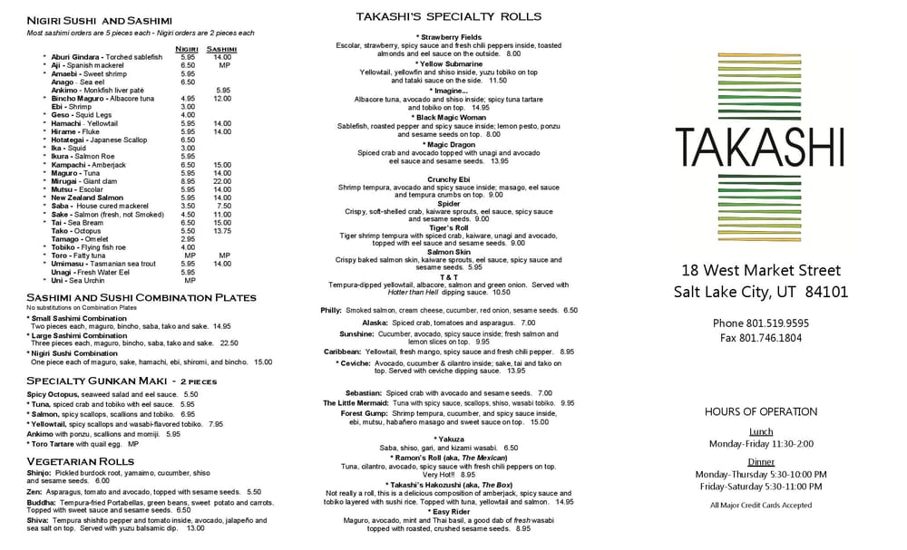 Takashi, a Japanese sushi bar in Salt Lake City, is a trendy spot with a casual atmosphere, perfect for groups and kids. Offering a variety of options, including pescatarian, vegan, and many vegetarian choices, Takashi caters to a diverse crowd. The menu features delicious soups like Soki Soba and a range of flavorful salads. Sashimi rolls like The Summit and riceless treats like Tuna Talaki are must-try dishes. Customer reviews rave about the unique selection, top-notch service, and exquisite flavors. While some find Takashi slightly overhyped, others praise its high-quality, fresh ingredients and excellent ambiance. Overall, Takashi stands out as a top choice for sushi lovers in Salt Lake City, with dishes like the Little Mermaid roll and premium nigiri leaving a lasting impression. The restaurant's commitment to quality and creativity makes it a must-visit destination for sushi enthusiasts.